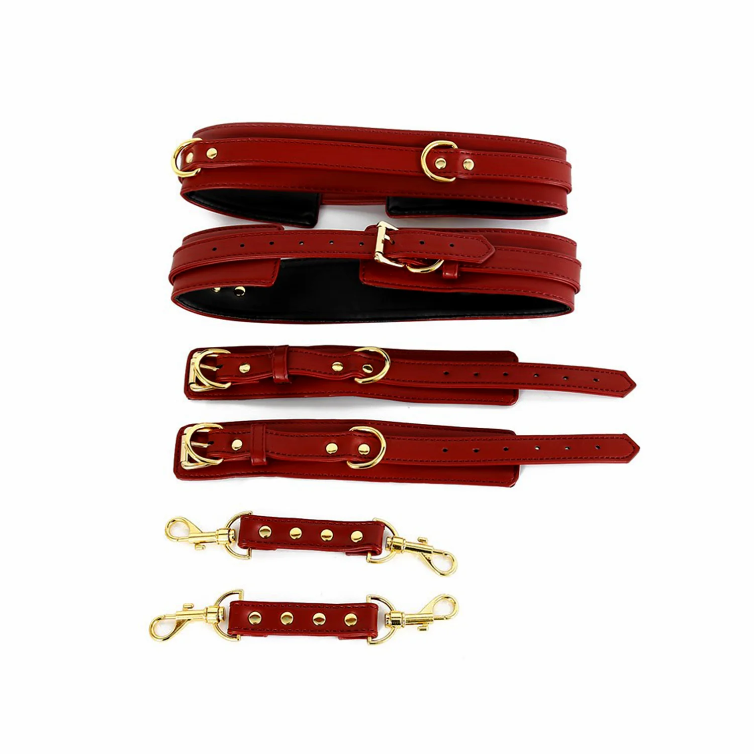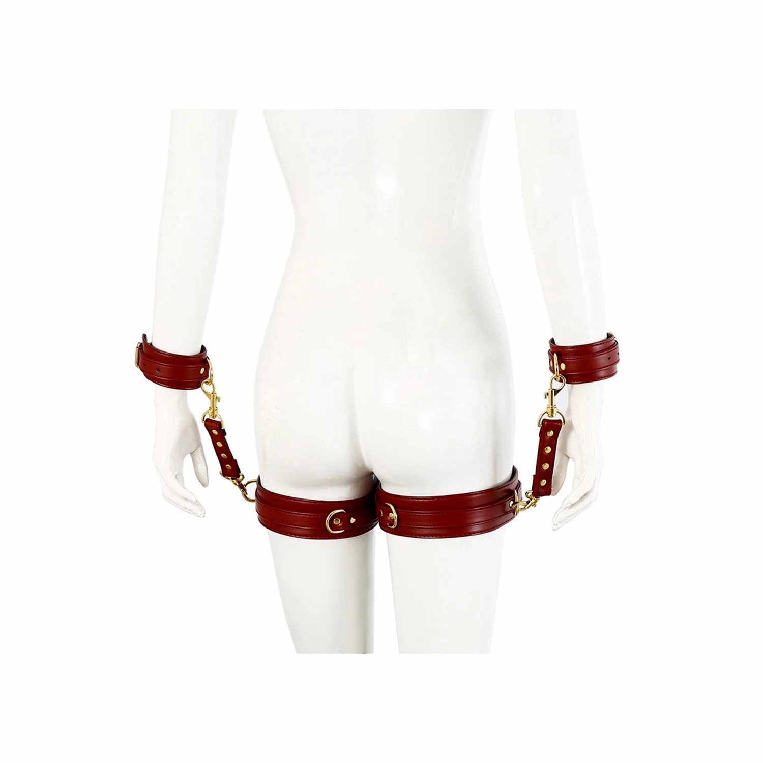 Este elegante set de cierre de hebillas doradas y correas desmontables está diseñado para restringir tus movimientos, ideal para Bondage o  BDSM. Imagina sentir cómo tus brazos se enlazan a tus muslos quedando a merced de tu amante.