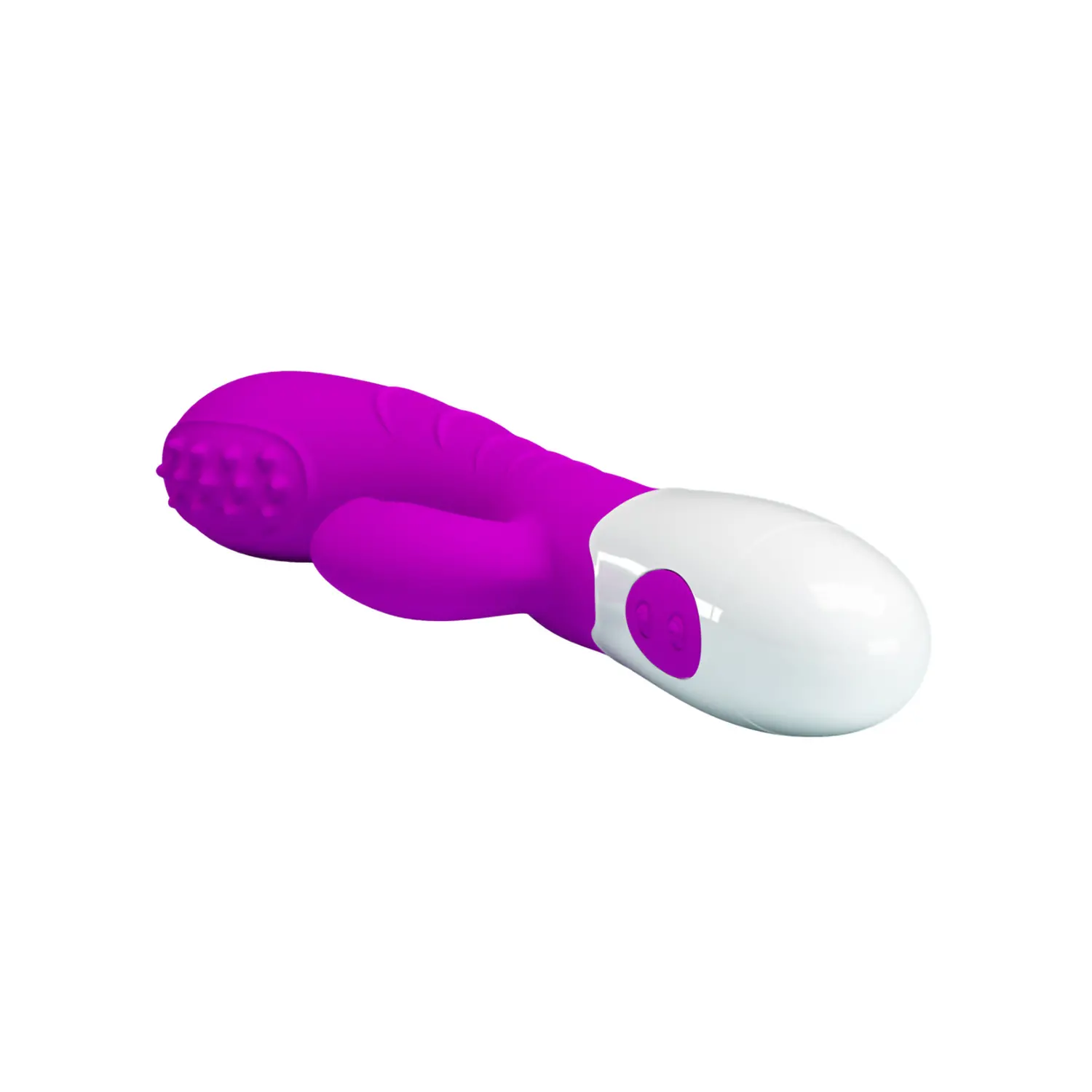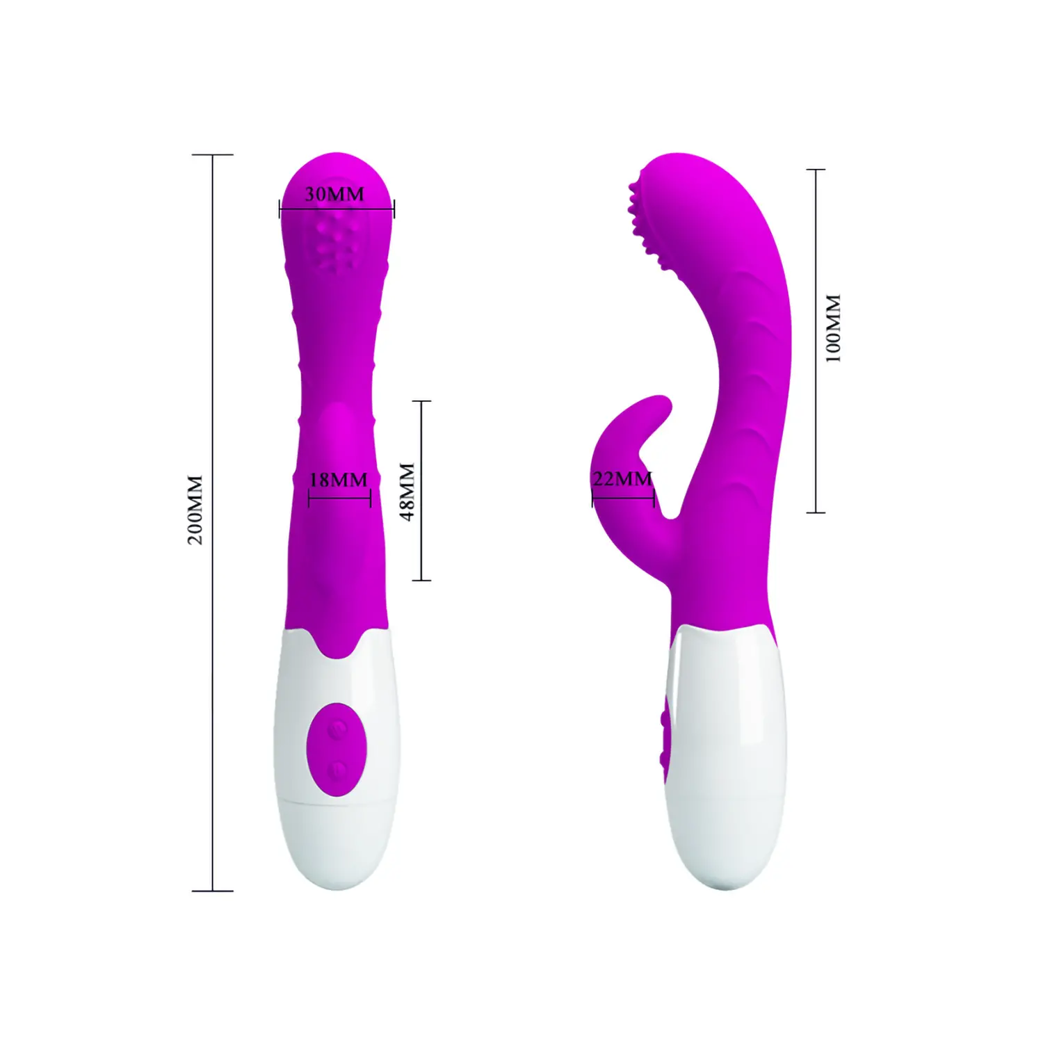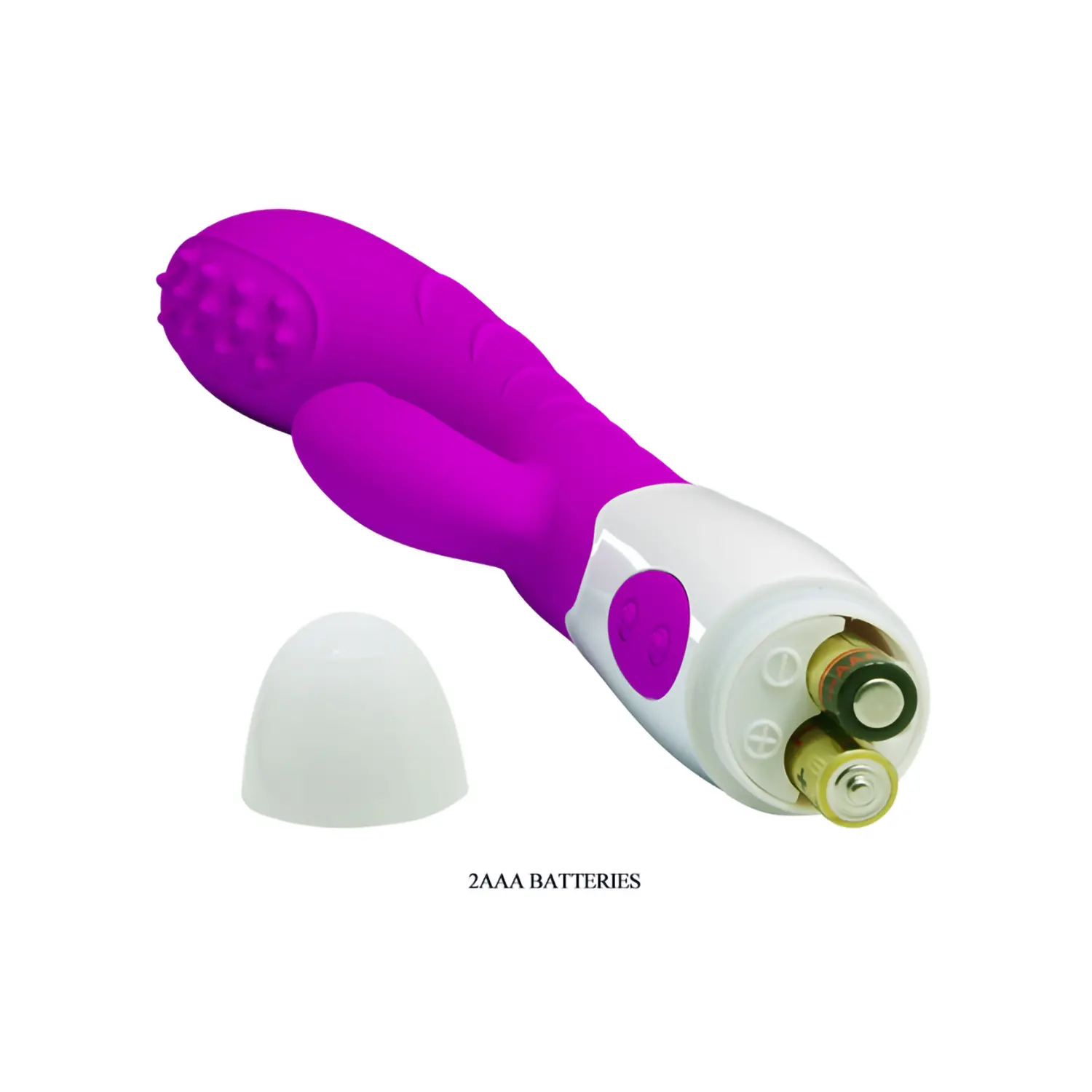 El nuevo Vibrador Doble Estimulacion Bruno posee un diseño curvo dual el cual permite tanto penetración como estimulación del clítoris y el punto G. Con 3 intensidades de vibración y 7 tipos de pulsaciones, lo cual permite entregar gran placer. La cubierta de silicona del eje tiene estrías a lo largo y pequeñas protuberancias en la parte superior, lo cual busca entregar más estimulación a los terminales nerviosos que están en el Punto G. Usa dos baterías AAA y es a prueba de agua, apto para lubricantes en base de agua.