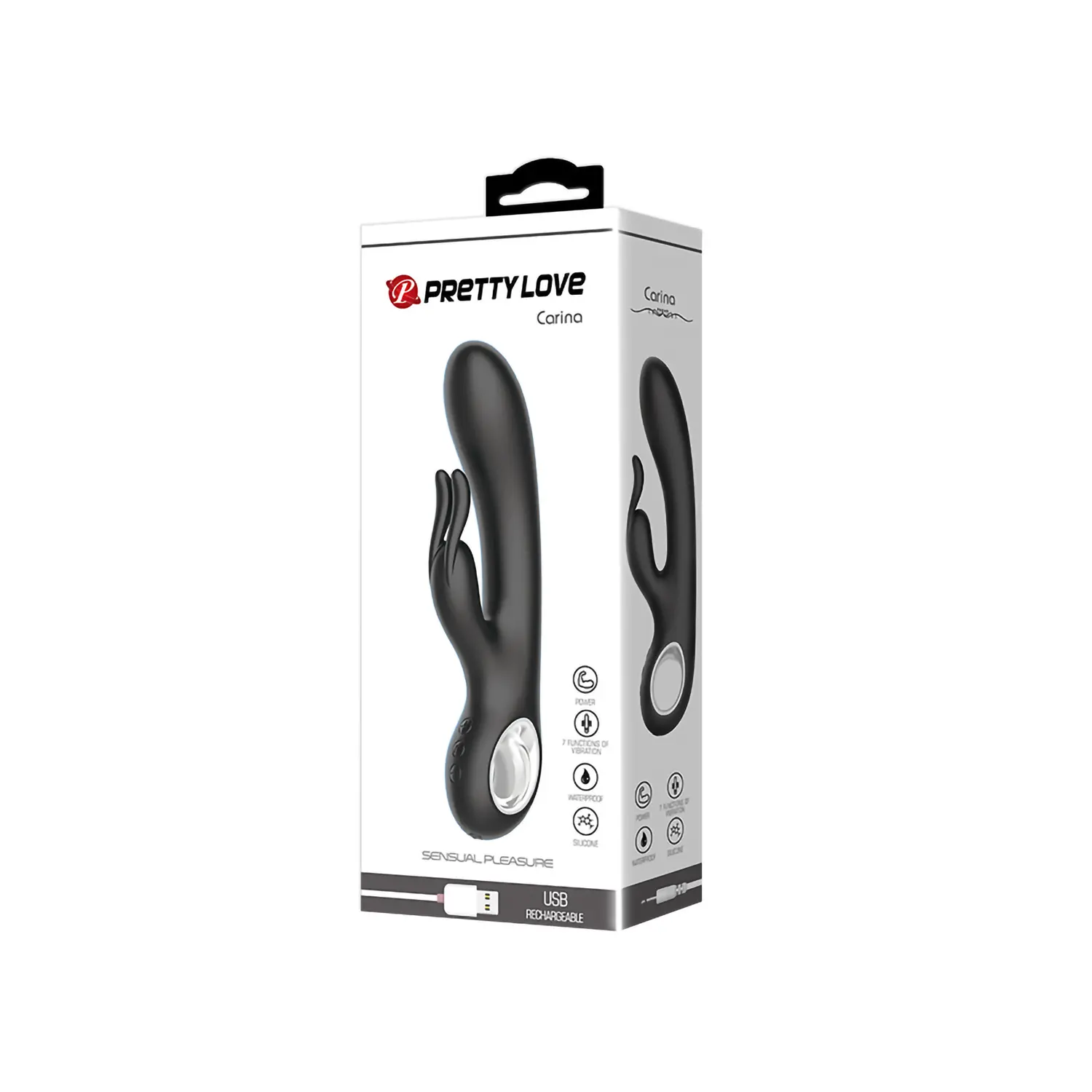 Con Vibrador Doble Recargable Carina disfrute del placer de un juguete sexual como ningún otro con este vibrador tipo conejo recargable. Este vibrador estimula el clítoris y el punto G simultáneamente con sus poderosas funciones de vibración. Hecho de silicona suave, el eje vibra poderosamente con una sensación increíble. Su forma está diseñada para apuntar fácilmente a su punto G y brindar sensaciones únicas. Cuenta con 7 configuraciones de vibración, recargable y sumergible.