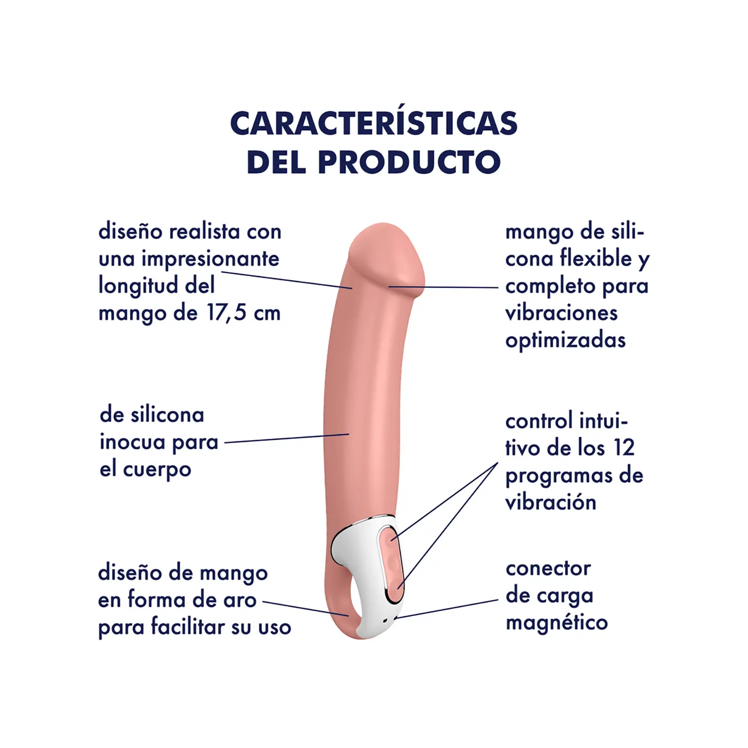 Con el Vibrador Satisfyer Master XXL disfrutarás de una potente vibración en formato XXL. Este vibrador tiene un diseño natural y cuenta con una longitud de inserción de unos 17 cm. Gracias a su mango fabricado completamente con silicona de alta calidad y a la tecnología Flex de silicona, el Master es especialmente flexible y, por tanto, transmite las vibraciones a los puntos calientes de forma especialmente intensa.